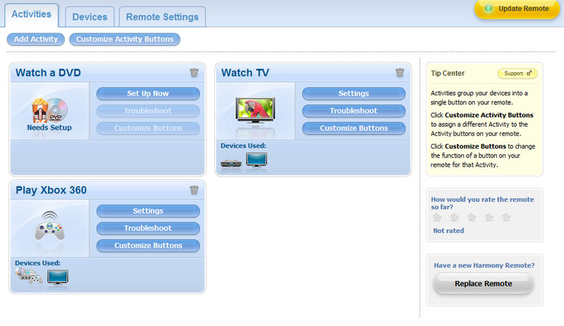 Creating a new one is fairly easy. You simply add all of the devices that you are using for the activity to the list. After it knows what devices to use, you tell it what needs to be activated, for example my TV needs to be on input HDMI-1 in order to play the Xbox 360. The activities and devices you have added, can be viewed and updated in the software at any point through this pleasantly simple summary page.