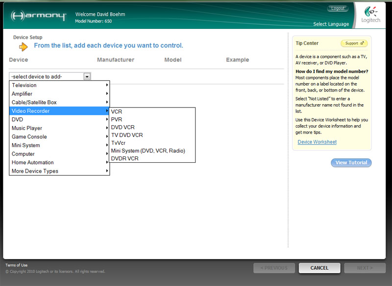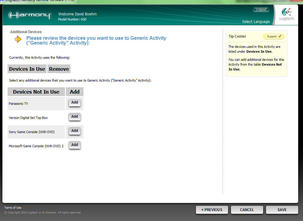 Once you have told your remote what sort of devices you have, you can then setup your "activities." Since doing certain tasks, like watching TV, might require manipulating several devices, the Logitech Harmony 650 handles these tasks by creating activity macros. Once more, Logitech has compiled a large list of activities that will satisfy most people. Logitech does a very good job with their predefined activities. The default "Watch TV" that was recommended to me was smart enough to use the volume controls with the audio system, the channel controls with my digital TV box, and leave the picture setting buttons to control the TV. If the activity you want is not in that list, or doesn't work quite the way you want, you simply create a new one or modify an existing activity.